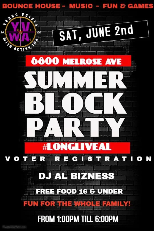 Join Young Voices with Action as we partner with community neighbors in University City on the 6800 block Melrose in brining to the community a time of laughter, love, fun, games and entertainment.