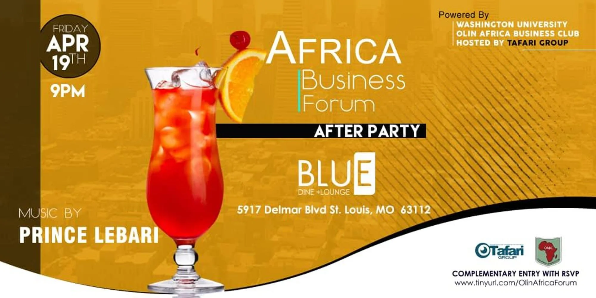 We look forward to having you join us for a Cocktail After Party at BLUE LOUNGE 5917 Delmar Blvd. This is the official afterparty for the 2nd annual Washington University African Business Forum.