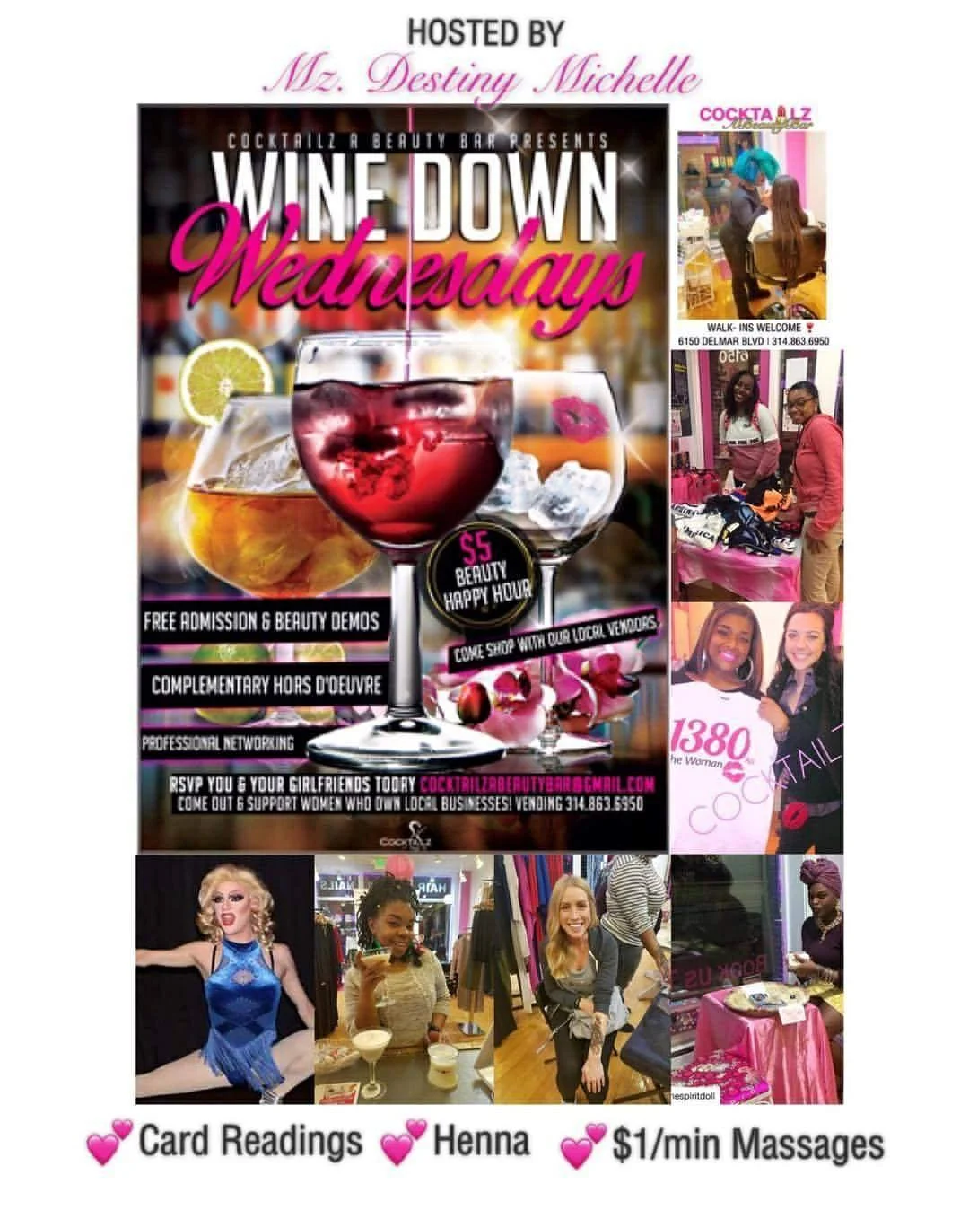 People LOVE what we are building togetherโฃ๏ธ SPACES AVAILABLE FOR OUR NEXT EVENT CALL NOW! ๐ 314.863.6950 ๐COCKTAILZ PRESENTS: Wine Down Wednesdays! THE ONLY #BeautyHappyHour IN THE CITY๐ EVERY SECOND WEDNESDAY from 6pm-9pm SAVE THE DATE! Your products would be a GREAT addition to our monthly event Wine Down Wednesday @CocktailzABeautyBar |CHECK OUT OUR Instagram & FB pages! Single event Wednesday Vending is $25 | ๐6 EVENT SPECIAL $100 We only accept 10 unique, small businesses to participate. If interested please reply with your email address and we will send you more info on how to sign up! We hope to see you soon โค๏ธ #BuildingSmallBusinessBrickByBrick #PleaseShare #Follow #TeamCocktailz #TagAFriend