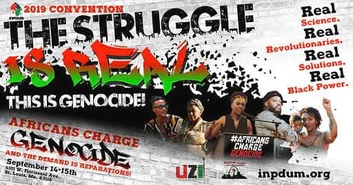 Africans and other colonized masses all over the world are getting involved in political life in largest numbers since the 1960s while it is evident that white power can no longer contain a world divided by colonial powers and the powerless colonized. Parasitic capitalism is falling apart at its seams and is in crisis everywhere on earth. From the shanty towns of South Africa to the Favelas of Brazil, from the ghettos of the united states to the garrisons of Jamaica there is constant crisis due to the resistance of African and colonized masses around the world. This year, from September 13 - 15 the International People's Democratic Uhuru Movement is having our 2019 Convention in St. Louis, MO to let the world know that there is an organization and a vehicle to obtain self determination and facilitate the death of imperialism. Our Convention is themed: The Struggle Is Real. This Is Genocide! Real Life. Real Solutions. Real Science. Real Revolution. The focus of this InPDUM convention is to expose the ways that Africans are facing genocide at the hands of colonial powers and how the solution is building an organization for self determination and the demand for reparations.