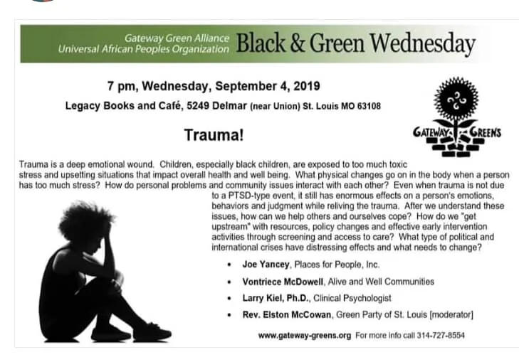 Black & Green Wednesday is a monthly forum covering environmental and social justice issues sponsored by the Universal African People’s Organization (UAPO) and the Gateway Green Alliance (GGA). This upcoming forum will deal with Trauma and its adverse impact on individuals and community, particularly poor communities. Guest speaker will talk about trauma and how to cope with its effect and places to find help. Guest speaker will include: Joe Yancey of Places for People, Vontriece McDowell of Alice and We’ll Communities, Dr. Larry Kiel a Clinical Psychologist and Rev. Elston K. McCowan will serve as the Host Moderator