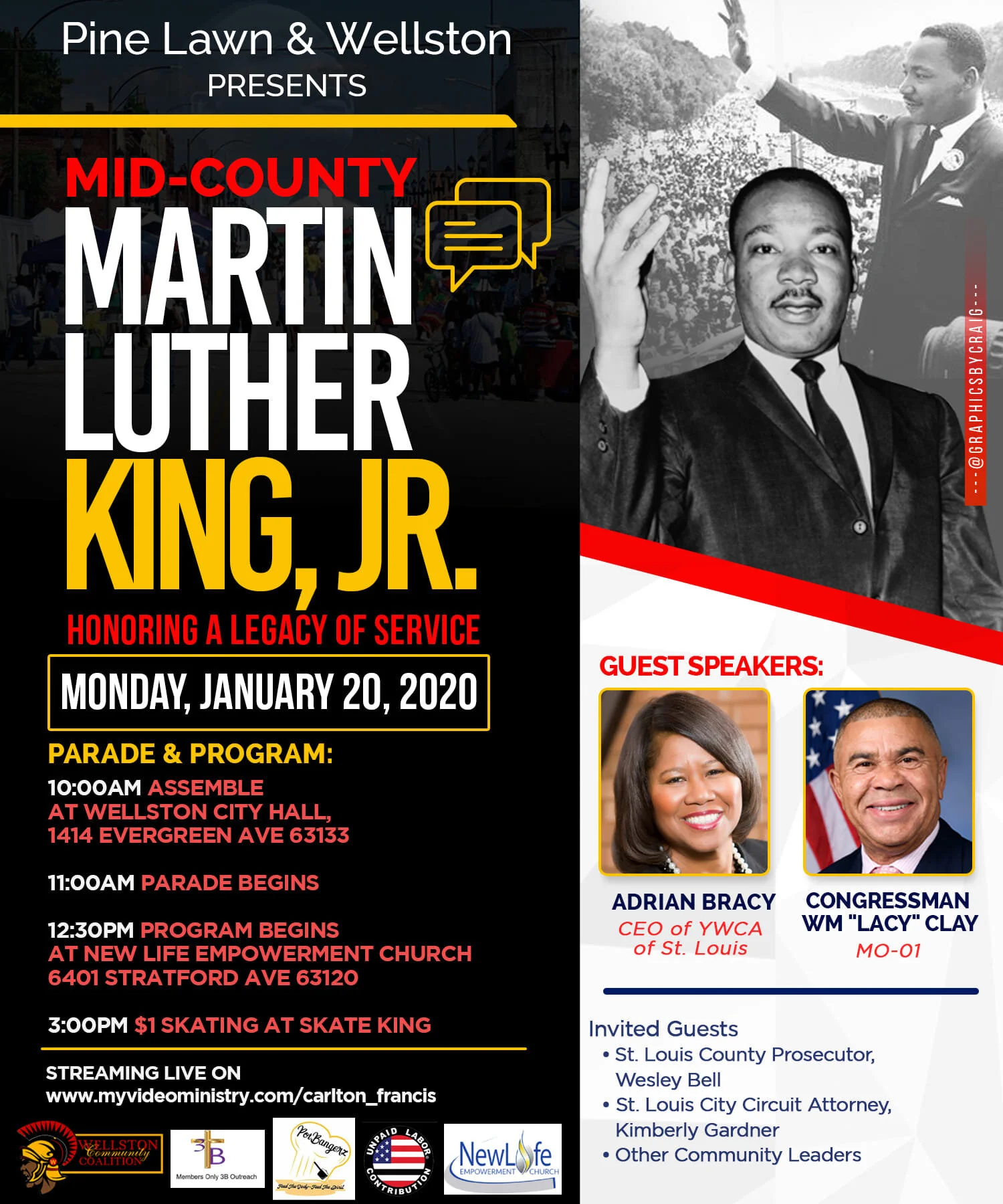 You are invite to be our special guest at the 5th Annual Mid-County Martin Luther King Jr Day Celebration presented by the cities of Wellston and Pine Lawn on January 20, 2020 at New Life Empowerment Church.