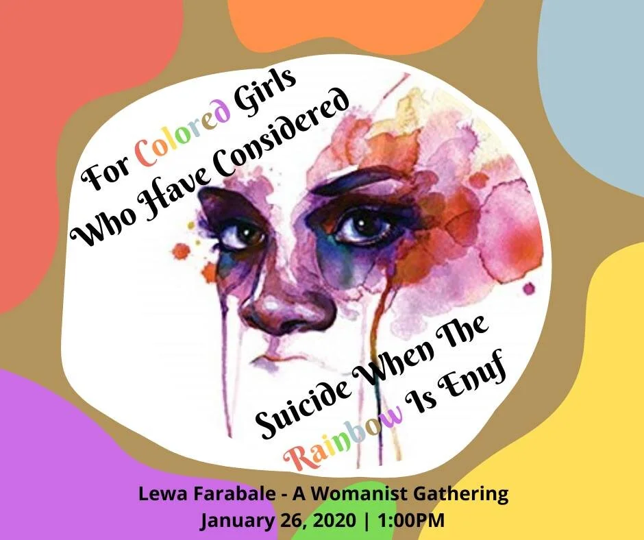 During this gathering we honor Ntozake Shange and her first work and most acclaimed theater piece, For Colored Girls Who Have Considered Suicide When the Rainbow is Enuf. We magnify the names of Bathsheba, Abigail, Ahinoam,Maacah, Haggith, Abital and Eglah from a womanist interpretation. They are the experiences of colored girls as the ladies in red, orange, yellow, green, blue, brown and purple.